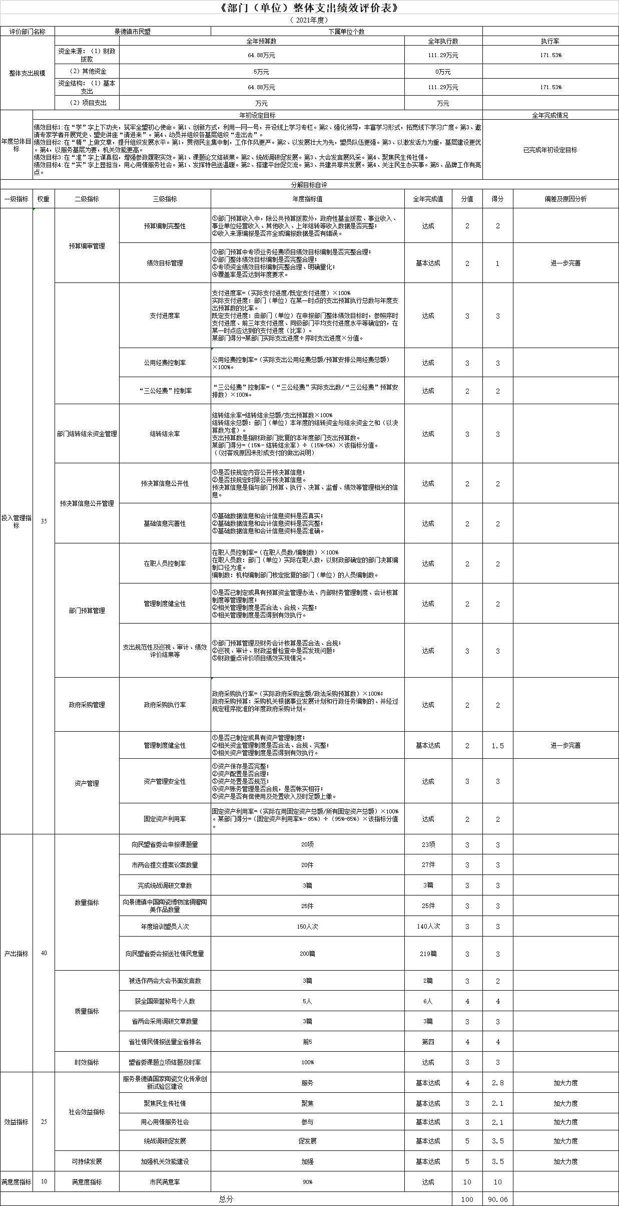 根据预算绩效管理要求,我部门组织对纳入2021年度部门预算全面开展整体支出绩效自评,共涉及资金111.29万元,占支出总额的100%。