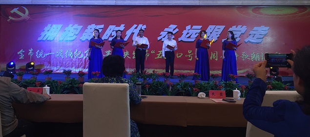 王安维带领盟员代表表演由民盟市委会集体创作的《民盟颂》,“我们爱国爱党的热情和太阳一起升起,我们民主民生的意愿随四季春风荡漾。新时代新征程召唤我们,让我们不忘初心,携手前进……”诵出了民盟市委会在中华民族伟大复兴道路上不忘初心、砥砺前行的坚定信念!