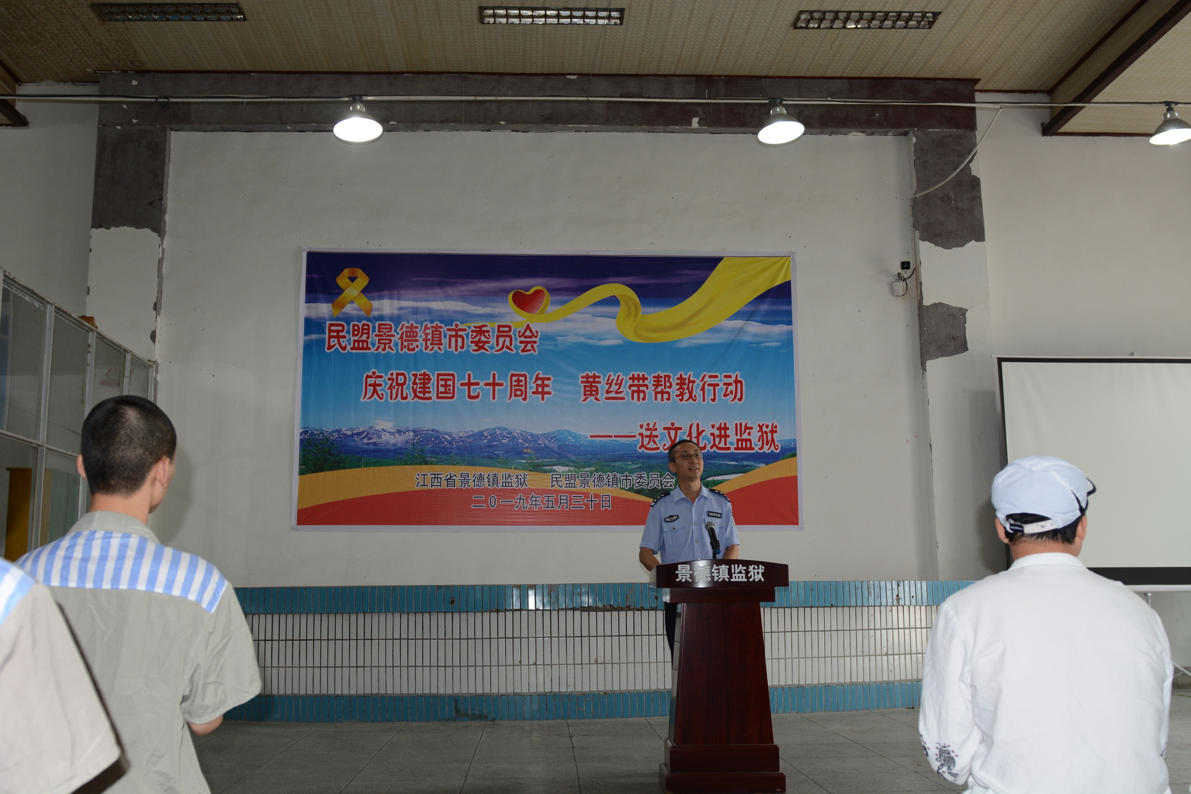 5月30日,民盟景德镇市委会在江西省景德镇监狱开展“庆祝建国七十周年 黄丝带帮教行动——送文化进监狱”活动。民盟市委会主委王安维,江西省景德镇监狱党委书记、监狱长吴成宏出席活动,民盟市委会副主委陈菊明,江西省景德镇监狱副调研员龚兵华,中共市委统战部党派科科长江静,民盟优秀陶美艺术家20余人参加活动。
