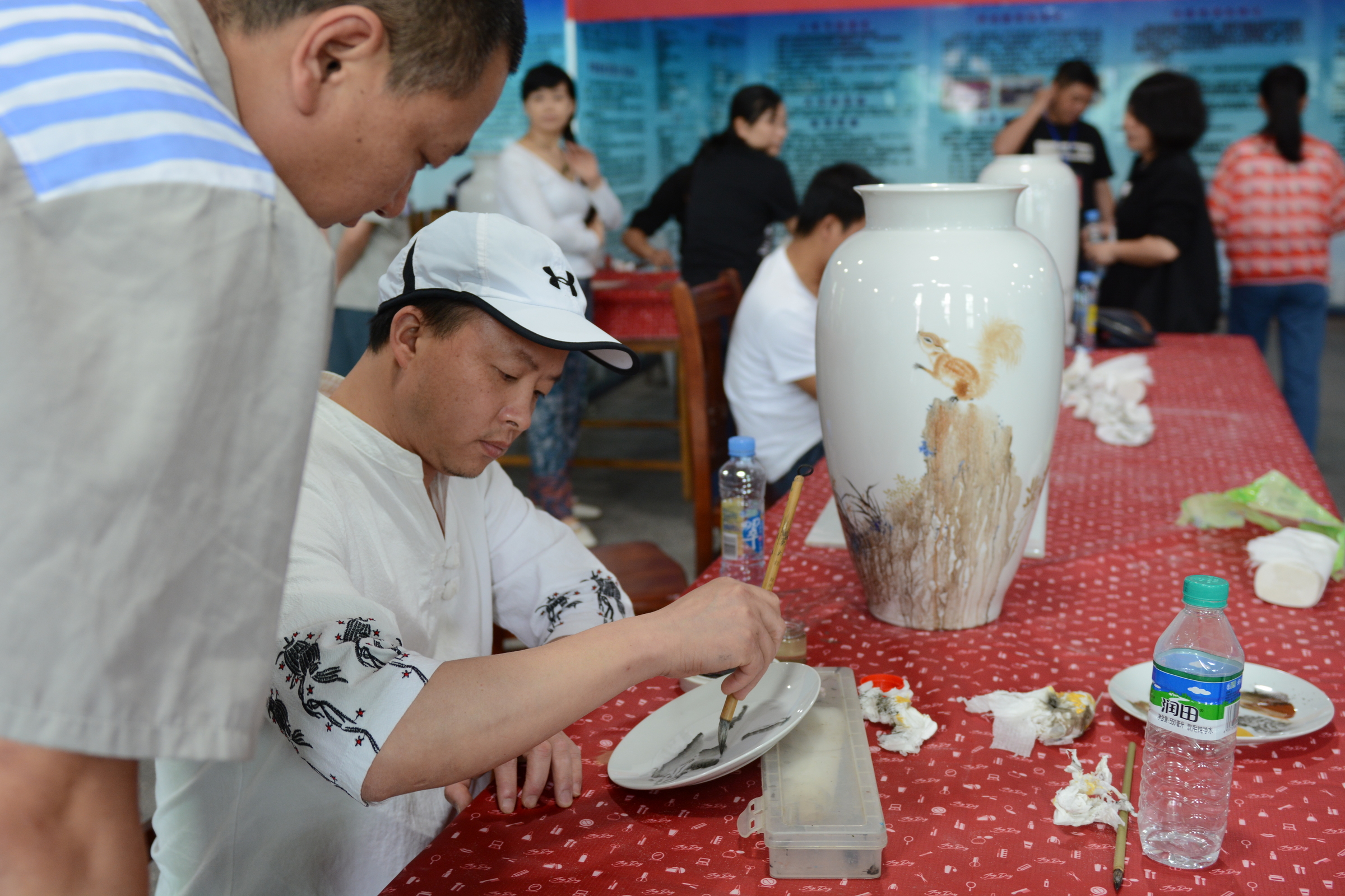 为庆祝建国七十周年,盟员艺术家们底蕴深厚,笔下生花,用妙趣横生的画作抒发对祖国的深情,作品异彩纷呈,各领风骚,充分展示出民盟盟员的艺术才华和精神风貌。此次参加活动的陶瓷艺术家们有二级教授、中国陶瓷设计艺术大师、江西省工艺美术大师、江西省陶瓷艺术大师和江西省高级工艺美术师等,创作过程中,他们与服刑人员现场互动,即兴创作陶瓷作品十八幅,全部捐赠江西省景德镇监狱,用以丰富服刑人员的文化生活。
