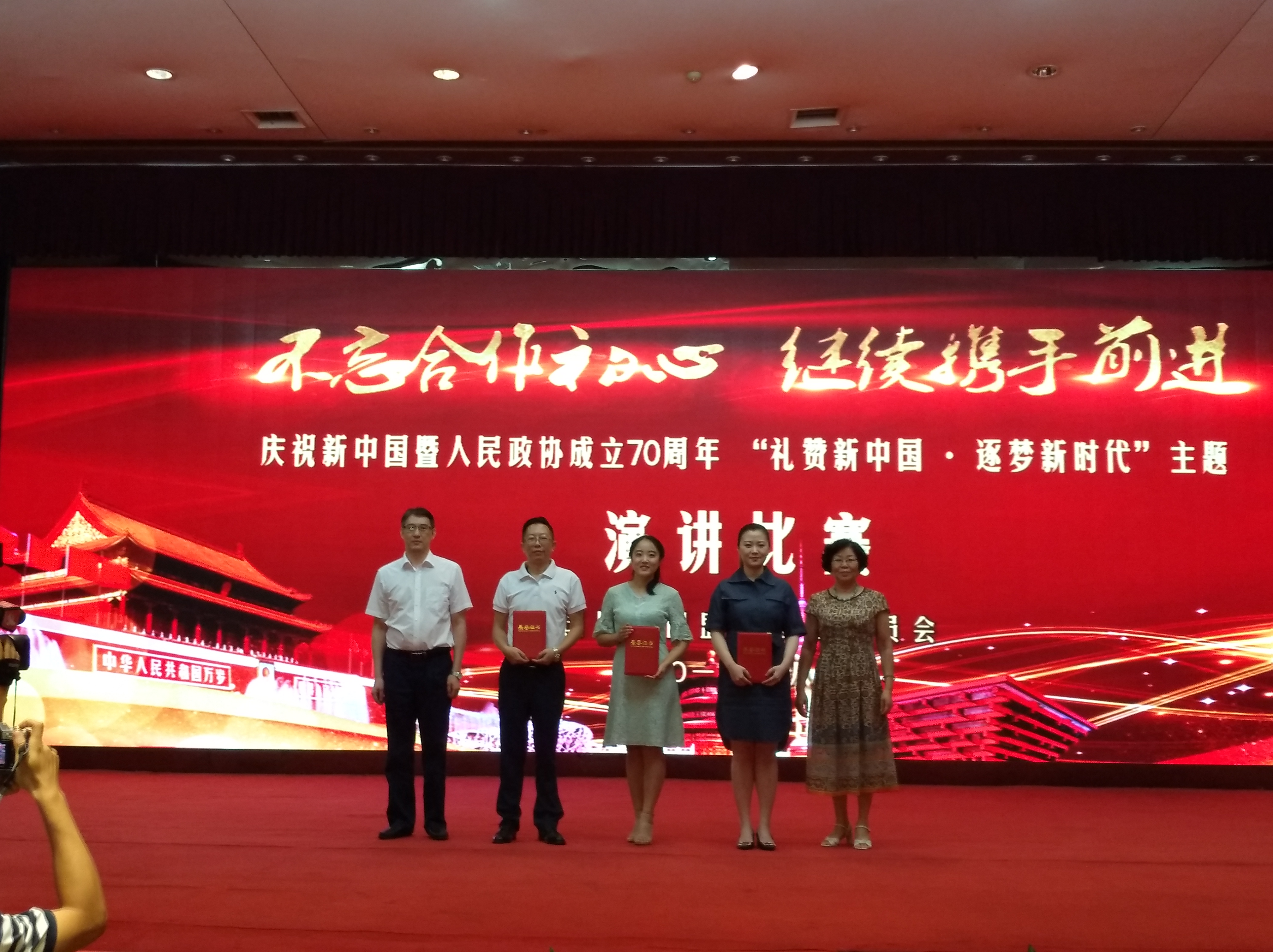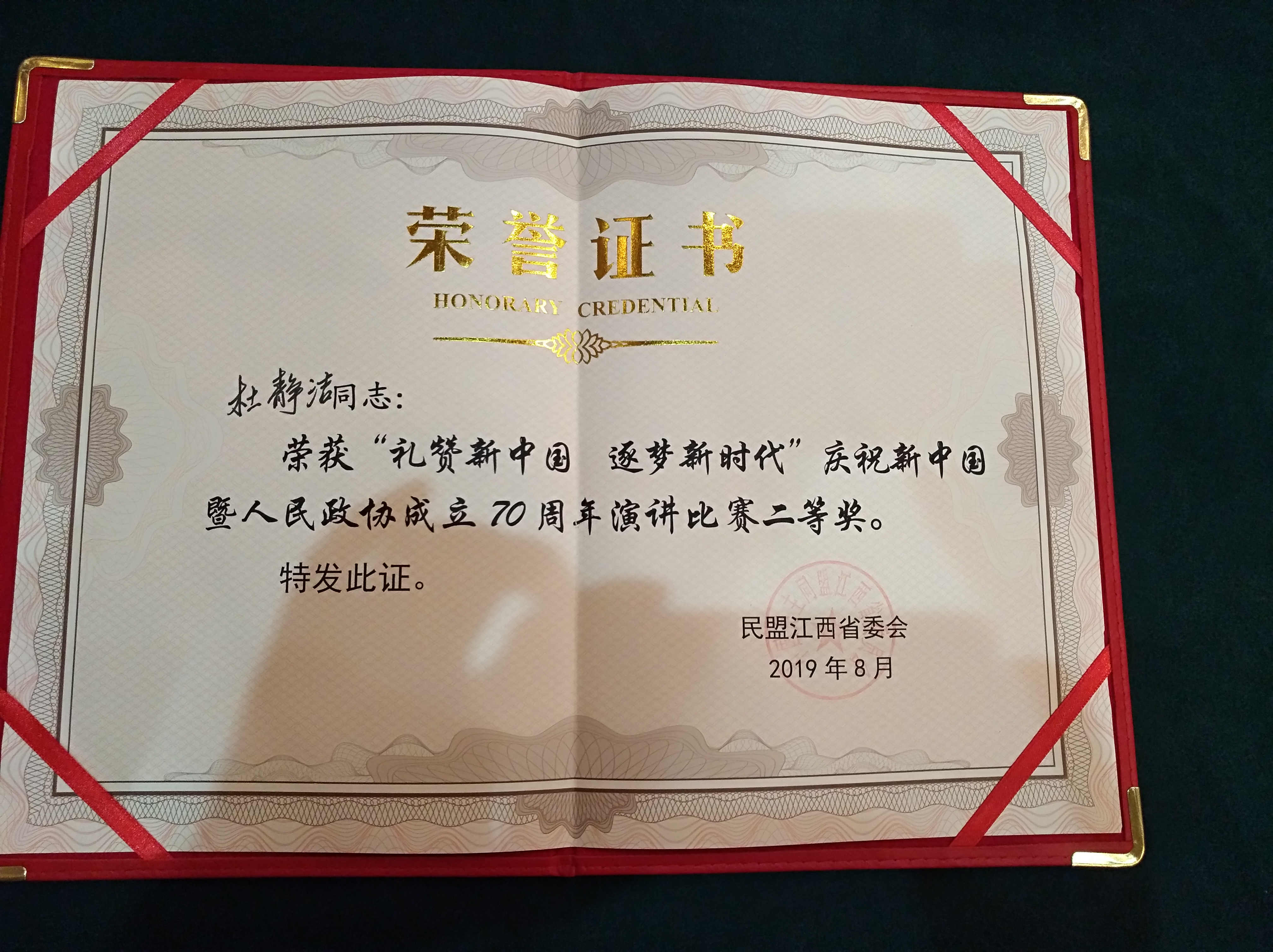 8月16日上午,由中国民主同盟江西省委会主办的,以“礼赞新中国,逐梦新时代”为主题的庆祝新中国暨人民政协成立70周年演讲比赛在江西饭店举行,来自各地市的19名选手参加了比赛。省政协副主席、民盟省委主委刘晓庄观看了比赛并为获奖选手颁奖。由民盟景德镇市委选送的选手杜静洁,经过激烈角逐,以题为“祝福祖国,逐梦新时代”的精彩演讲,揽获了二等奖。