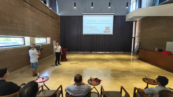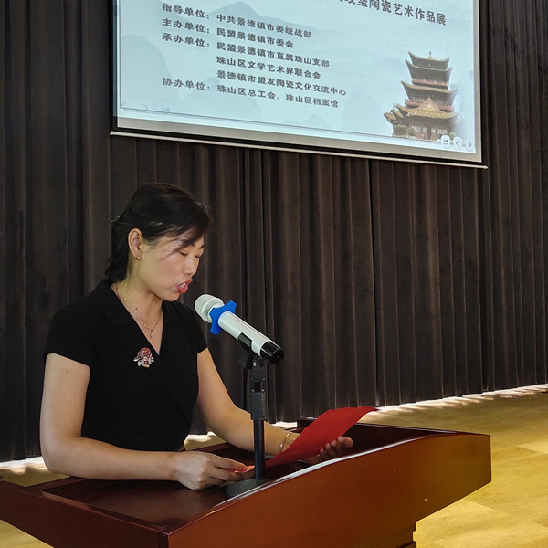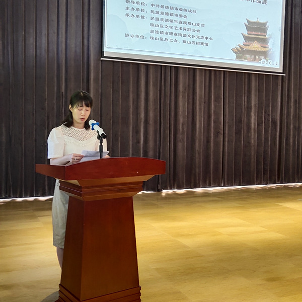 民盟景德镇市直属珠山支部副主委刘斐介绍展览情况