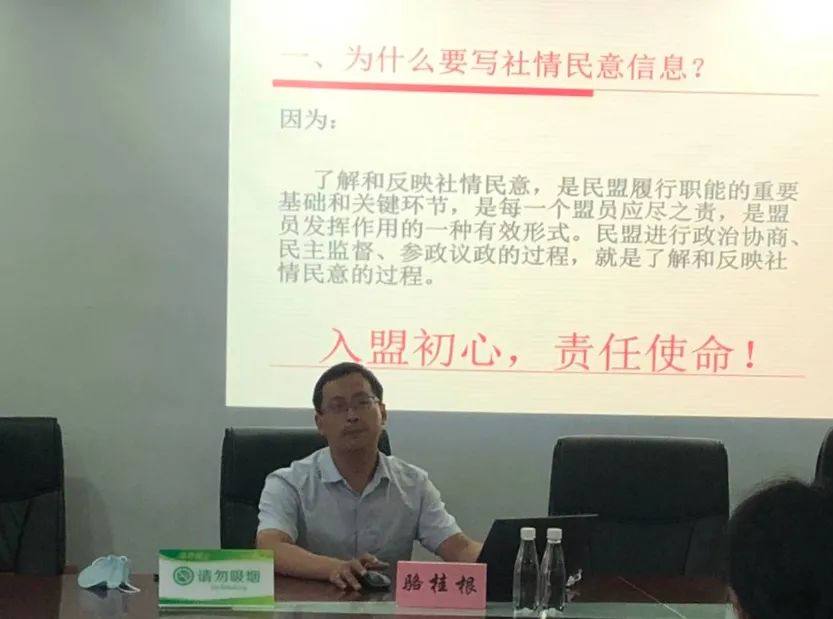 骆桂根从撰写社情民意的意义、选题技巧、写作技巧几个方面进行了全面的讲解,并对本人撰写优秀稿件的经验进行分享;安祥从自身撰写社情民意稿件经验出发,对如何提高撰写积极性作了经验分享;陈莹从本职工作经验出发,针对社情民意撰写应当切实可行并具有广泛性、全局性等特点进行经验分享。三位盟员的精彩发言,使培训具有很强的针对性和实践性,对撰写高质量社情民意稿件、做好参政议政工作具有重要的意义。