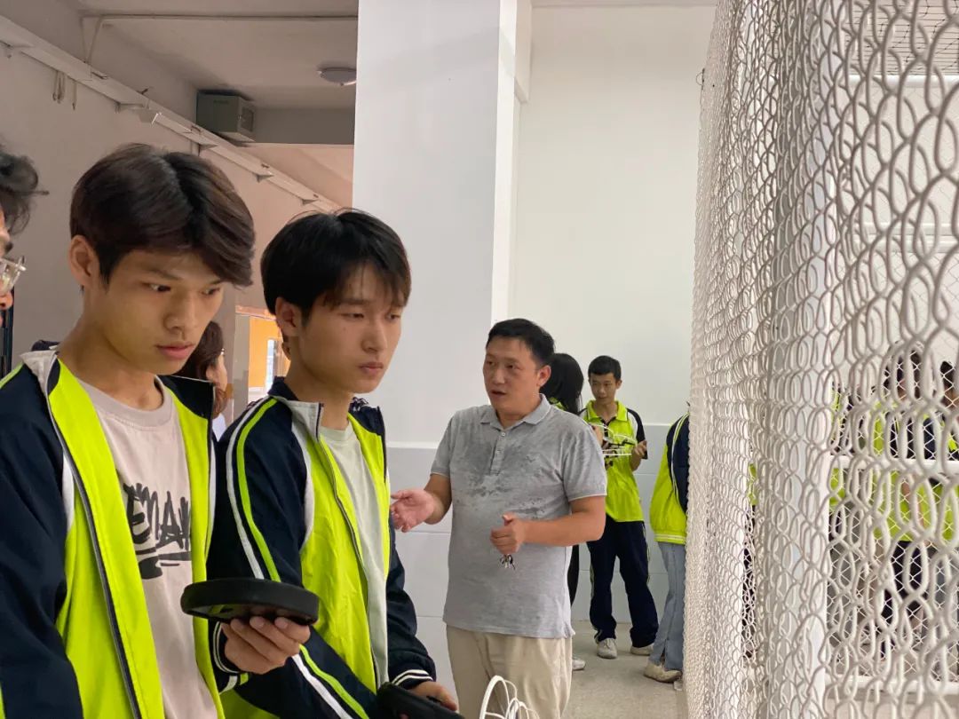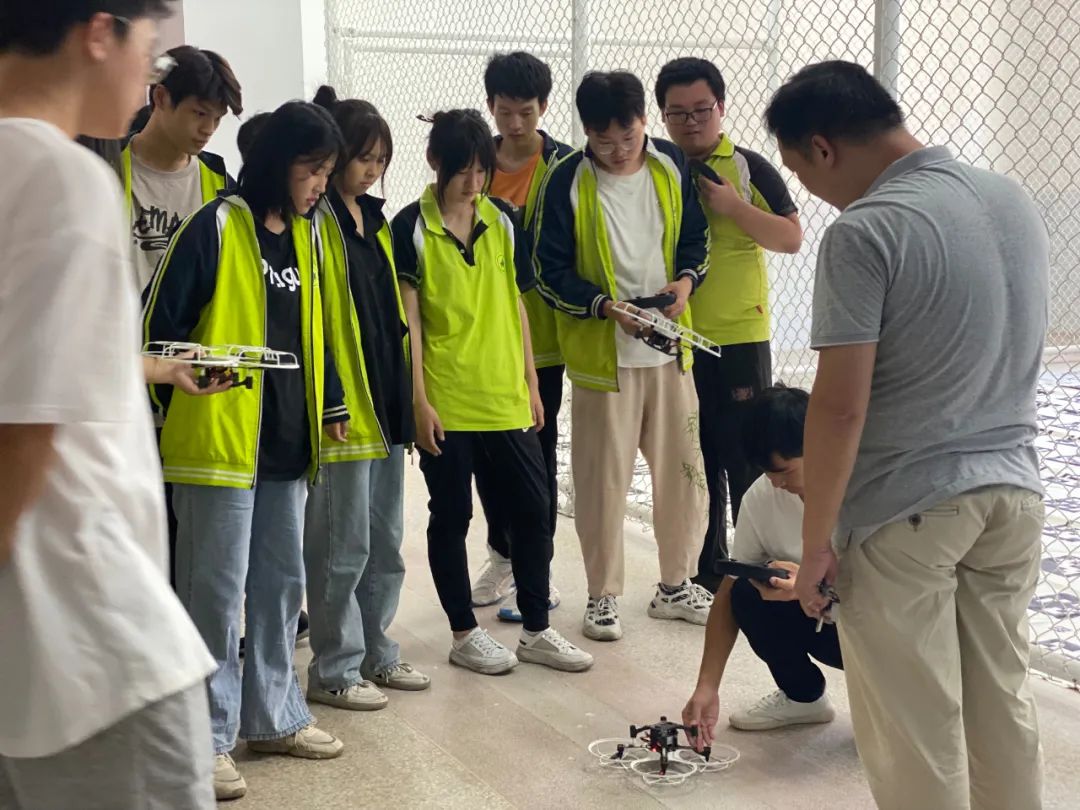 理论讲解结束后,活动进入实际操作环节。王老师给同学们进行实际操控演练展示,讲解实操注意事项,并指导同学们练习独立操控无人机、悬停等无人机飞行专业技术。
