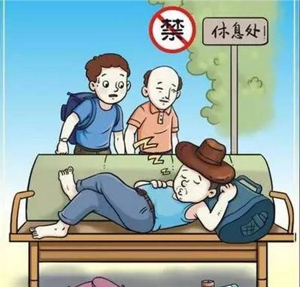 文明解读:公共场所椅子是供游客走累了短暂歇息的,可现在常常有人躺在条椅上睡大觉,不仅霸占公共资源,给其他需要休息的游客带来不便,不雅的姿态也会让人感到不快,给周边风景抹上了不和谐的一笔,破坏了景观的优美。
