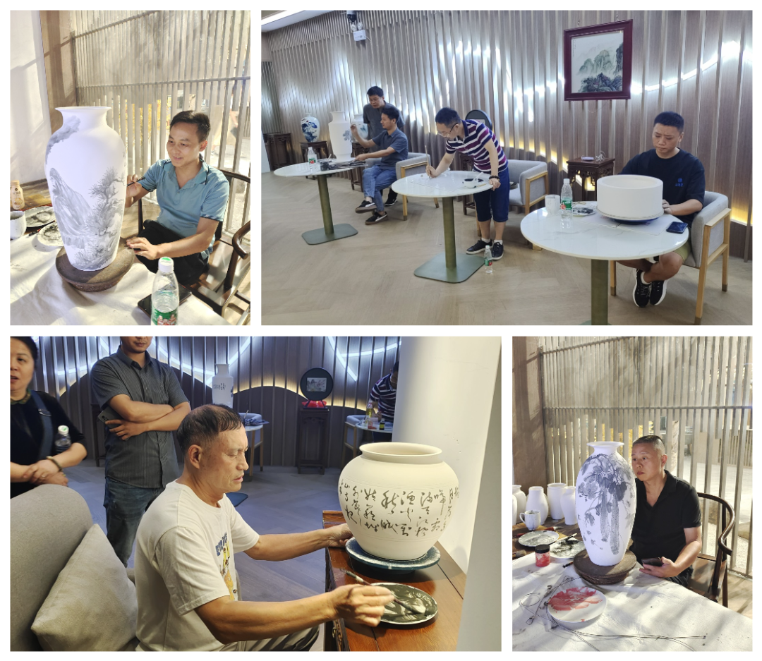 创作交流现场,盟员们挥毫泼墨,或写或画,以瓷为媒,以画传情,有绿水苍山、水墨花鸟等内容的陶瓷书画作品逐一呈现,展现艺术家们坚定的文化自信和深厚的爱国情怀。