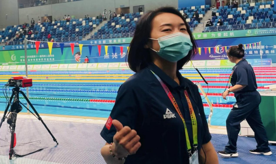 鲜为人知的是,靳颖老师除了是一名高校教师还是中国游泳协会在籍注册会员,游泳项目国家级裁判。2021年10月22至10月28日“中华人民共和国第十一届残运会游泳项目比赛”在陕西西安奥体中心游泳跳水馆举行,靳颖老师凭借着良好的专业素养和较高的职业道德修养在此大赛中担任技术官员。