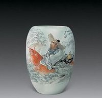 王隆夫《琴高跨鲤》粉彩瓷瓶作品赏析 此件作品以神话《搜神记》为题材创作,描绘的是琴高跨鲤递入涿水中取龙子时的情景。画面布局构思精巧,波涛汹涌,狂风乍起,云雾弥漫,气势盖天,用以渲染琴高淡定执着的性情。琴高眉头紧锁,髯髯垂须,昂首远视,显示出艰险无畏、抗争不屈的道骨仙风。作品借鉴了任伯年、陈洪绶的人物画风格,笔势劲疾,跌宕起伏,纵横挥洒、老辣超迈,用线极具金石味,落笔重顿折多,圆中带方,高古奇骇,古韵盎然,将骨法用笔发挥到了极致。 作者简介 王隆夫(B.1931),别号"昌南子",祖父王昌彬为清光绪、宣统年间御窑总办。系景德画院院长、中国美术家协会会员、江西省文史馆馆员、高级工艺美术师、中国工艺美术大师。擅绘古代人物及意笔花鸟。
