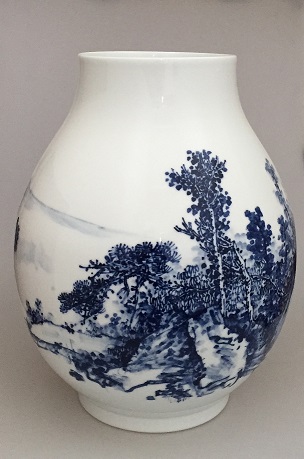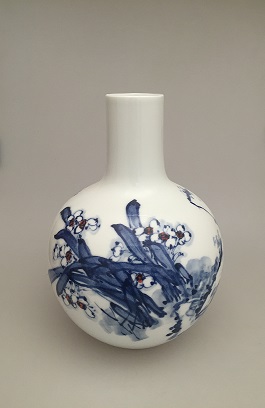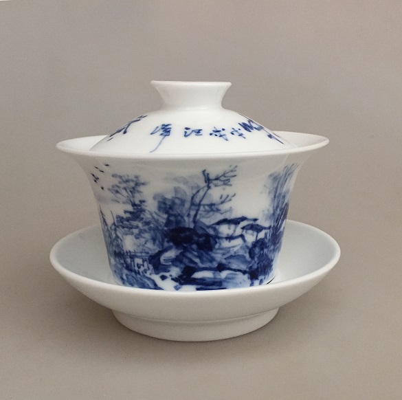 从上到下左、下右依次为青花盖碗《山水》、青花瓶《水仙》和青花瓶《山水》。